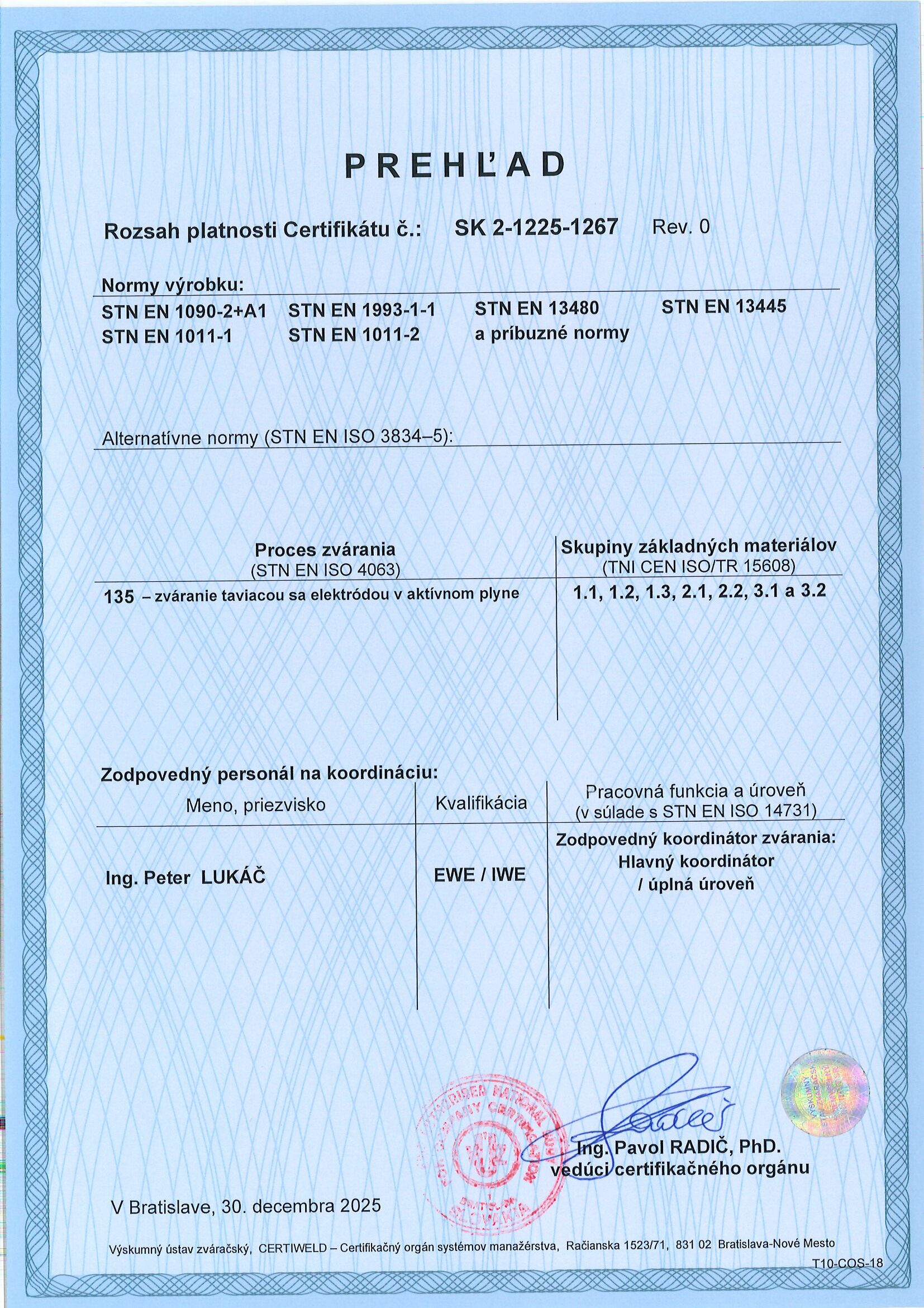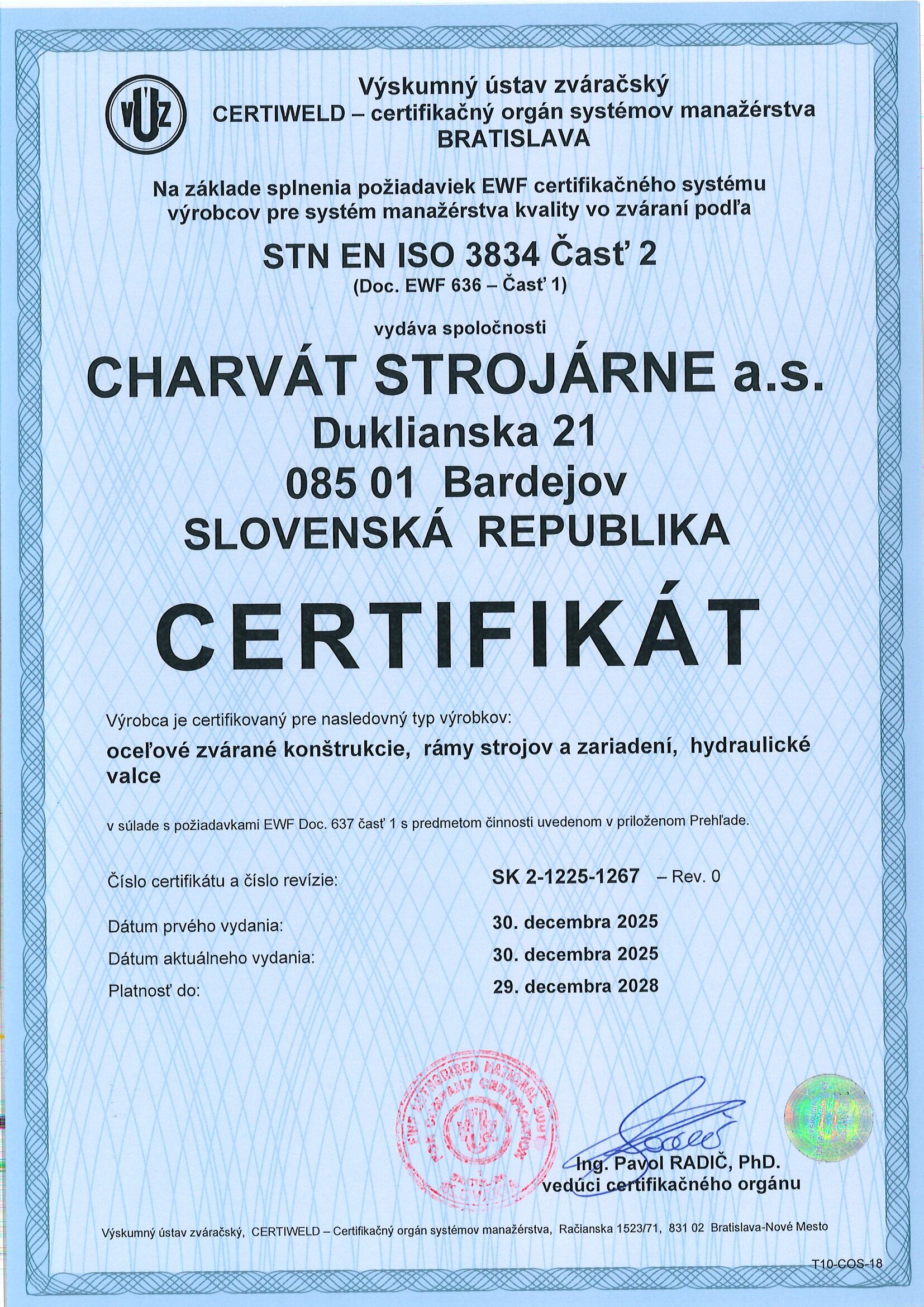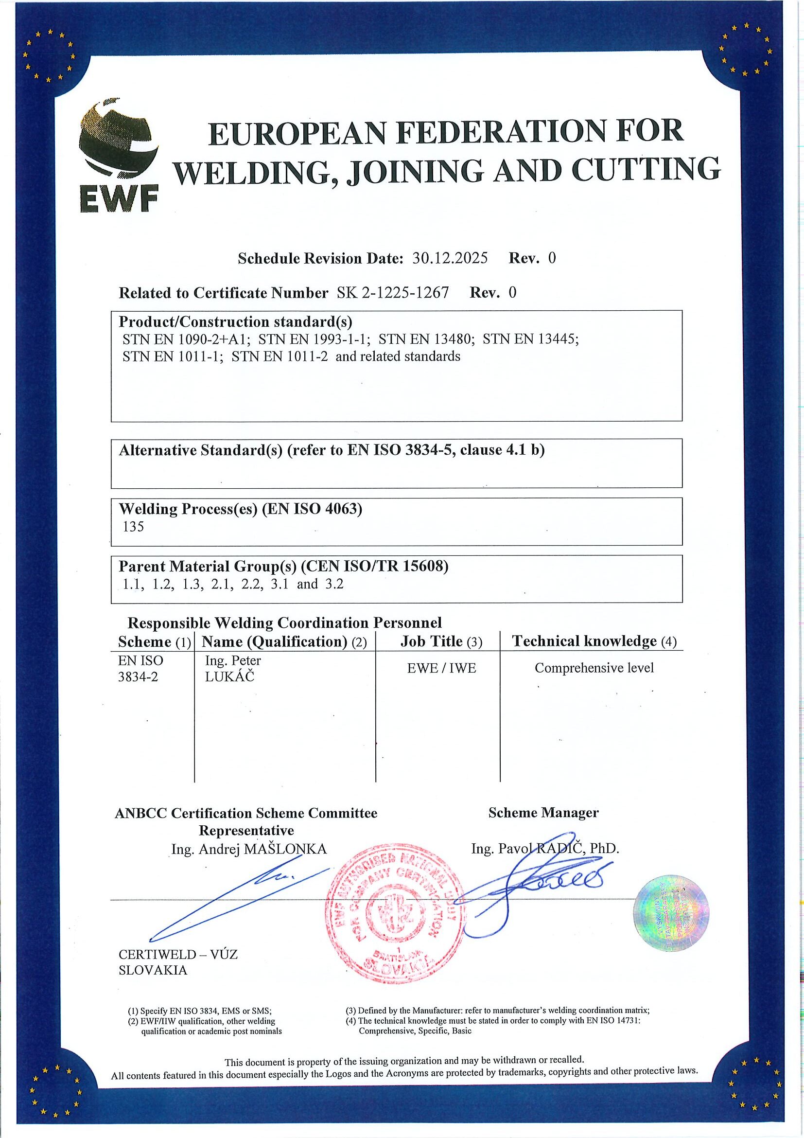 Naša spoločnosť Charvát v mesiaci December úspešne absolvovala prvýkrát previerku na získanie certifikácie podľa normy EN ISO 3834. Získaním tohto certifikátu sa v našej spoločnosti zvýšila kvalita zvárania finálnych produktov ako aj samotného procesu zvárania ako takého.