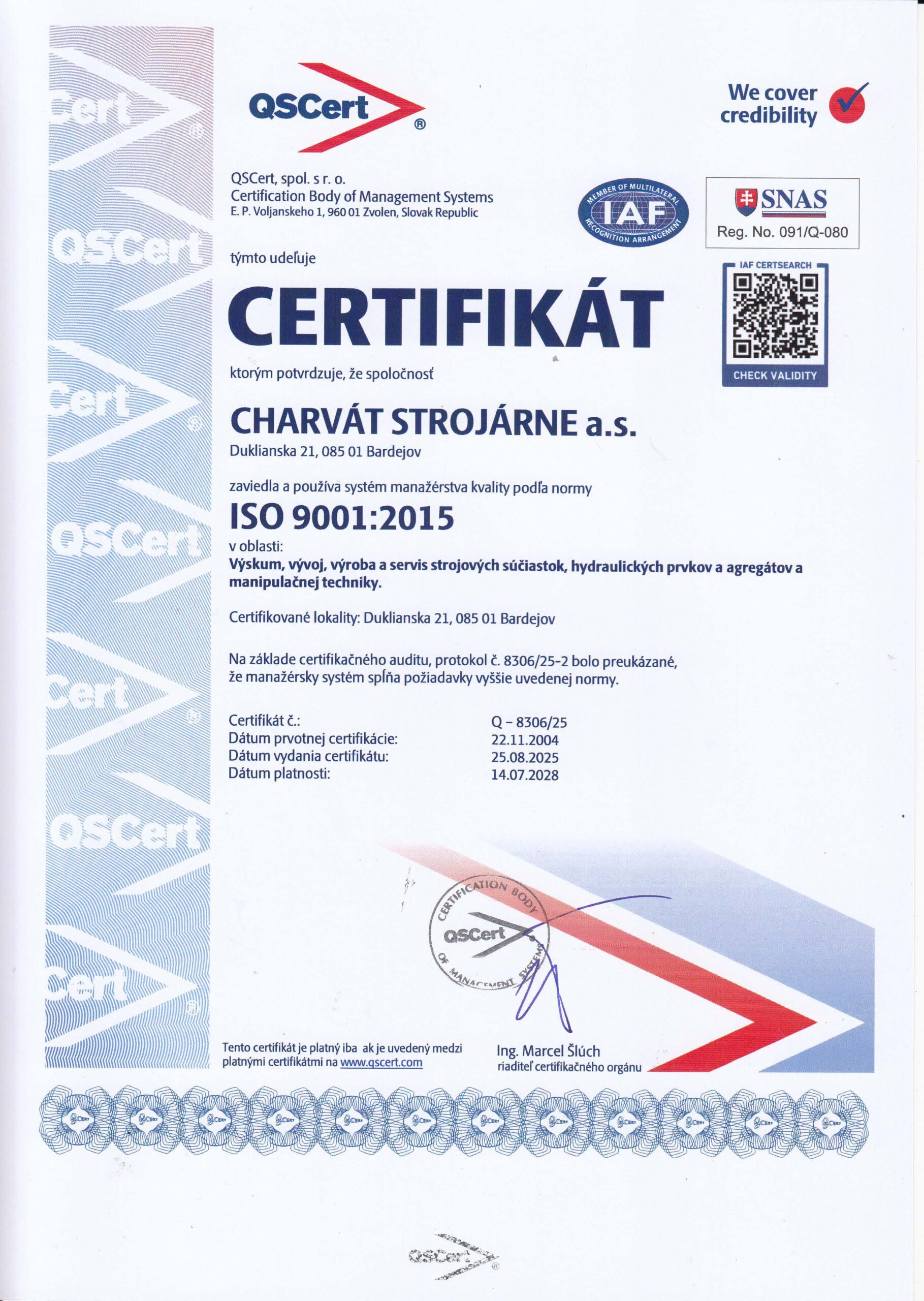 Spoločnosť zaviedla a používa systém manažérstva kvality podľa normy ISO 9001:2015 a ISO 14001:2015 v oblasti výskum, vývoj, výroba a servis strojových súčiastok, hydraulických prvkov a agregátov, kľukových hriadeľov a manipulačnej techniky.